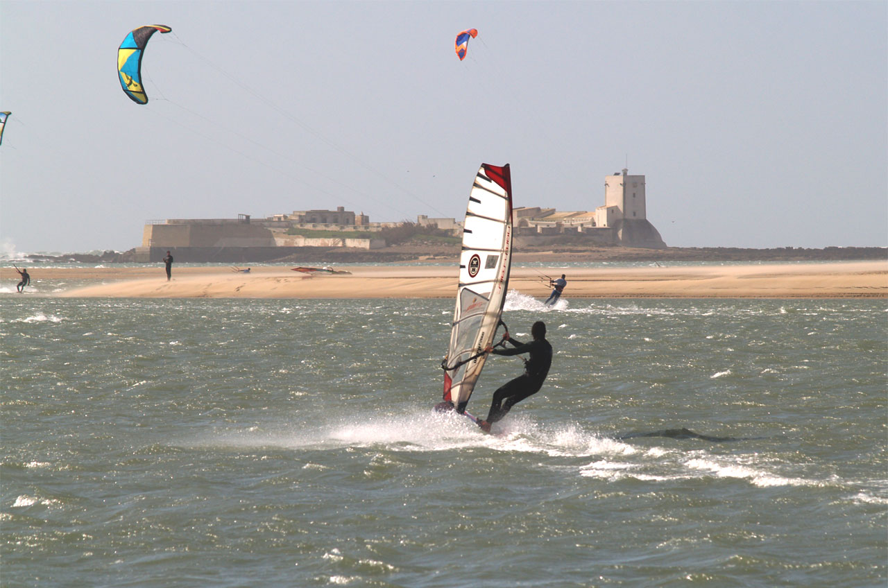 Podrás navegar en condiciones de agua plana para freestyle en la desembocadura y con olas espectaculares junto al Castillo de Sancti Petri.